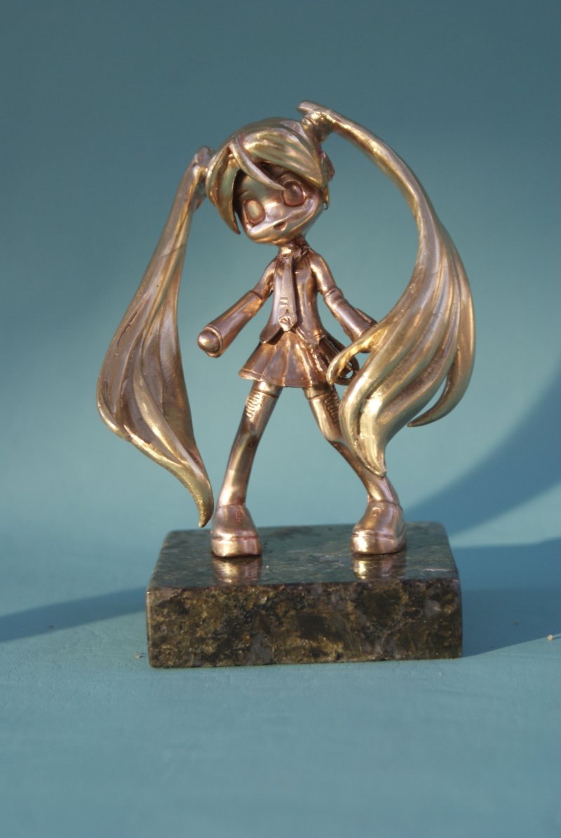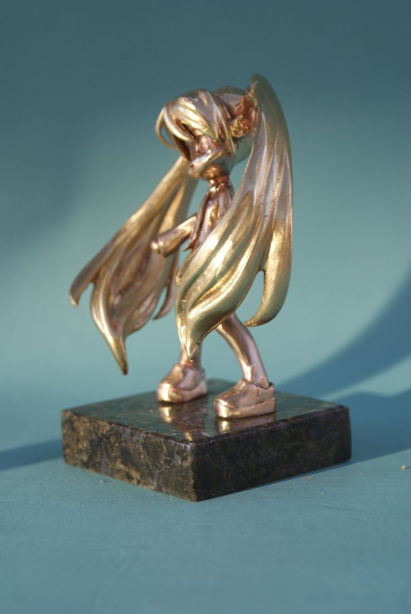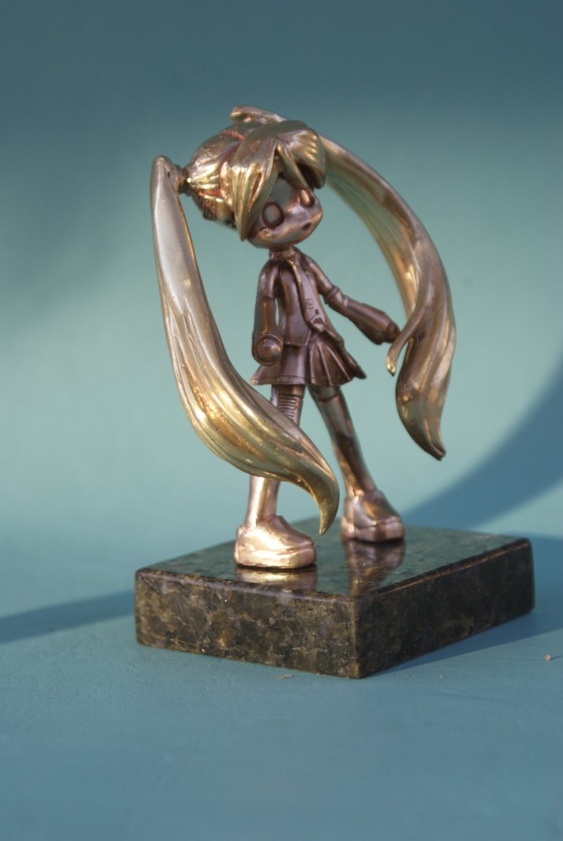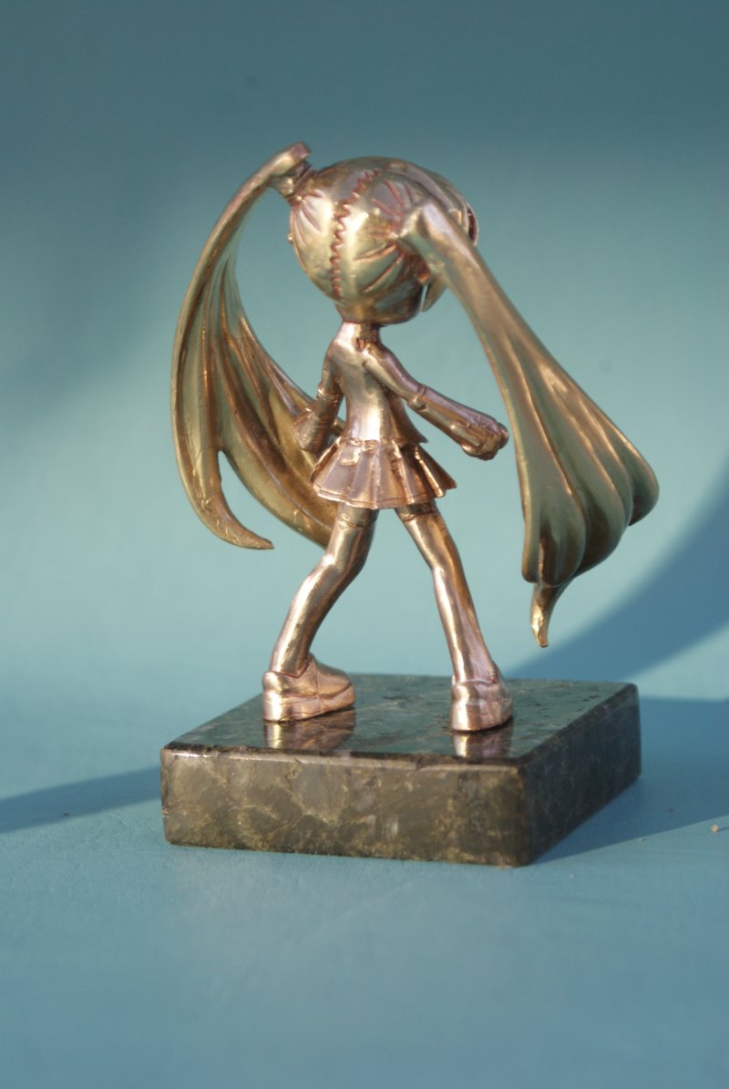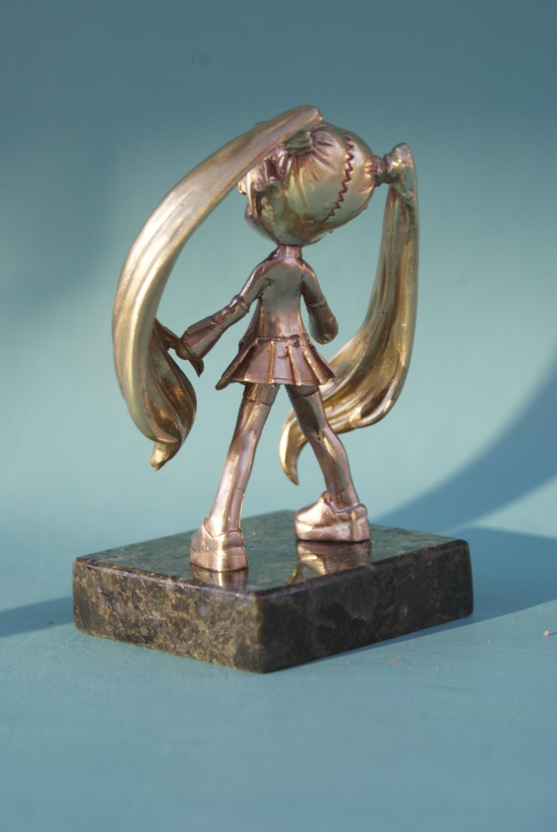 Photographs of Hatsune Miku in bronze.