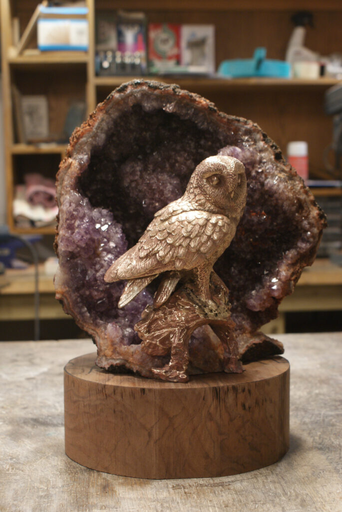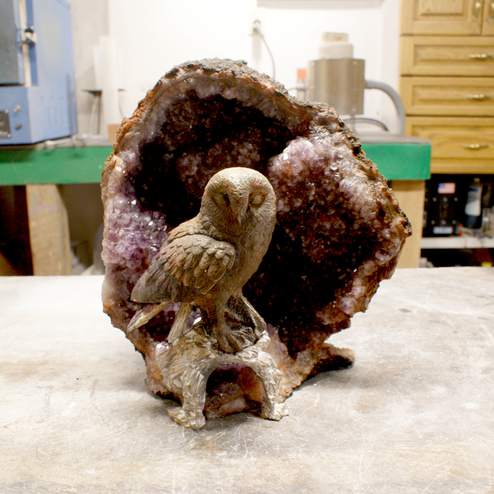 The feet on the base was extended to fit the geode. The base wax was also hollowed in the back to reduce the metal requirements.