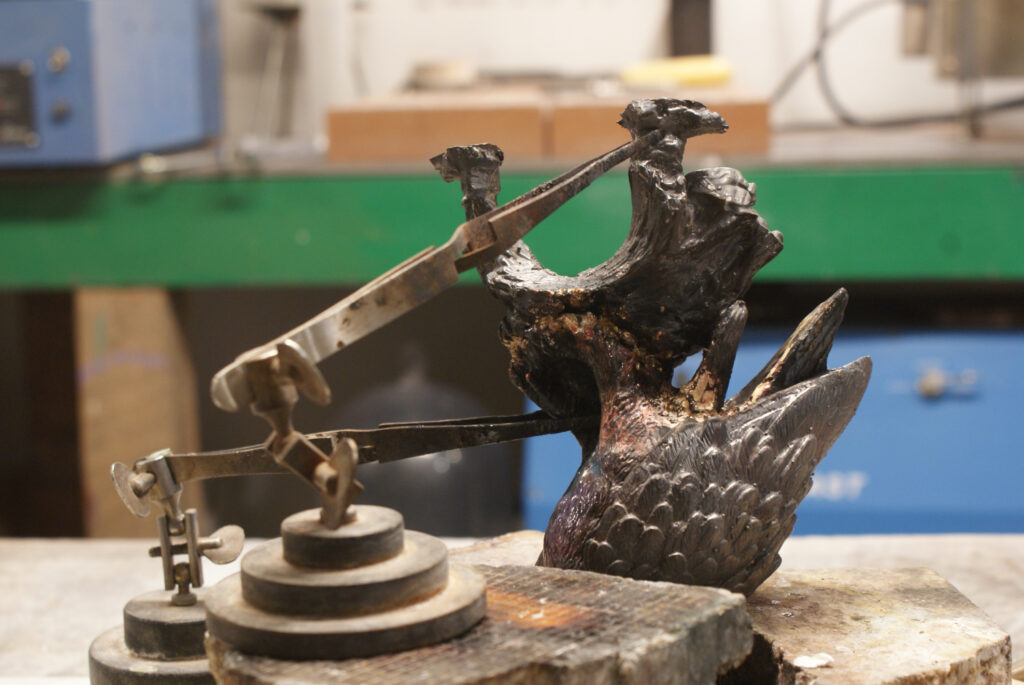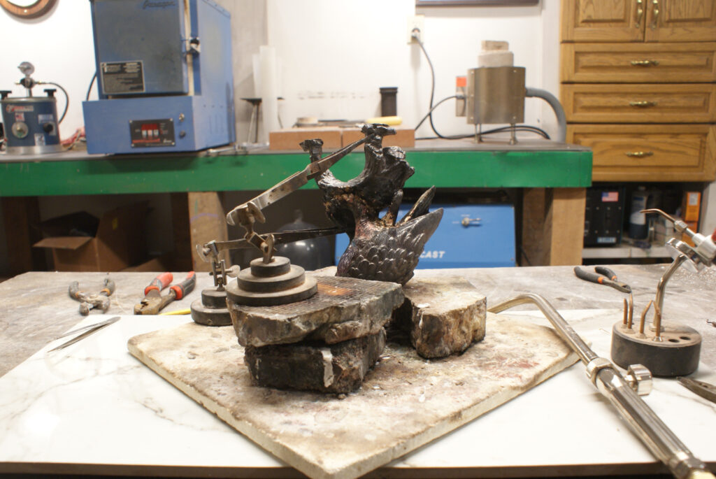 Welding the bronze requires both of my torches. The piece will be set on a 3×8 inch walnut round.