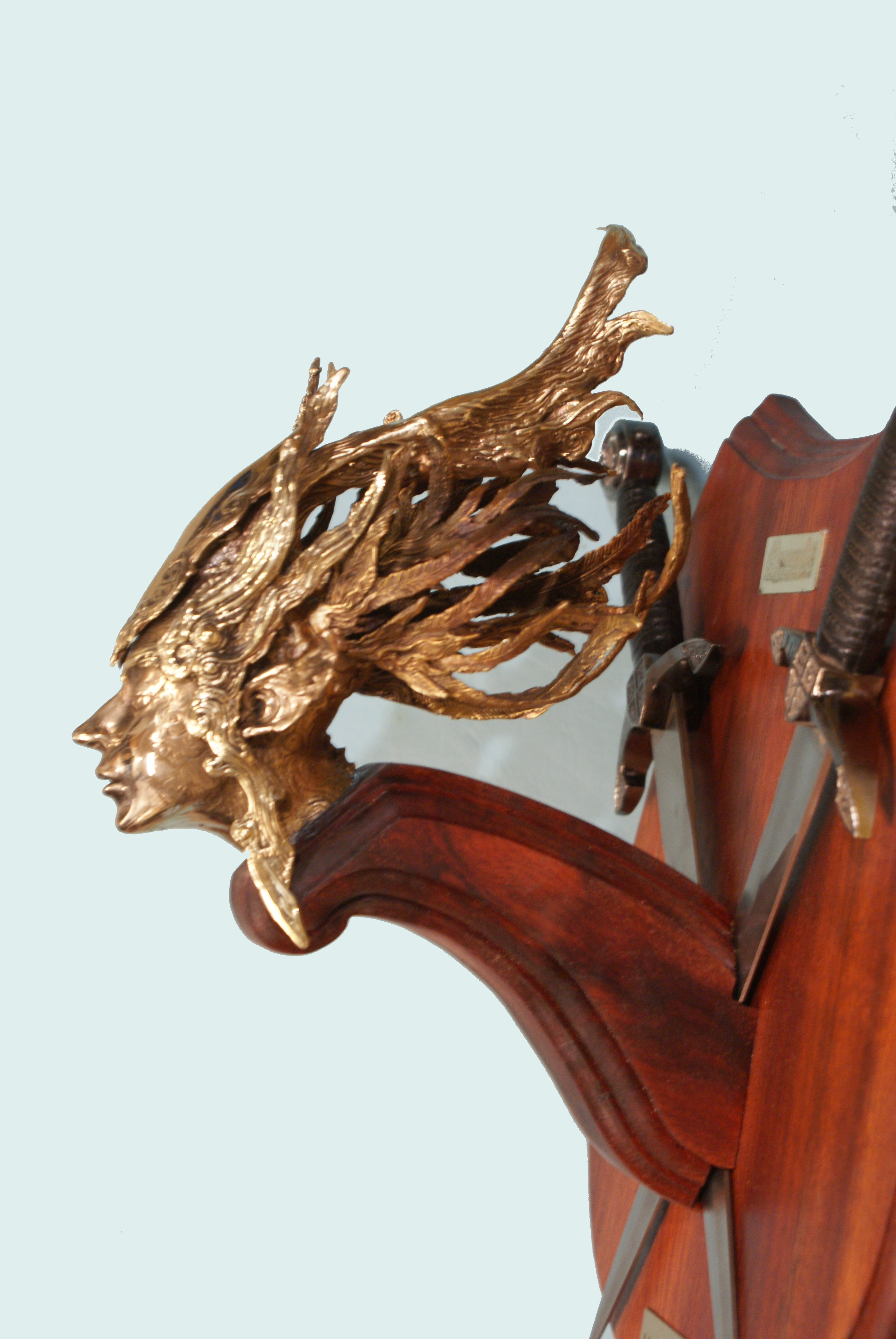 The elf head is cast from silicone bronze.  The decorative material is cast from yellow brass.  A ferric nitrate patina was applied to the basic hair fronds and the back of the neck.
