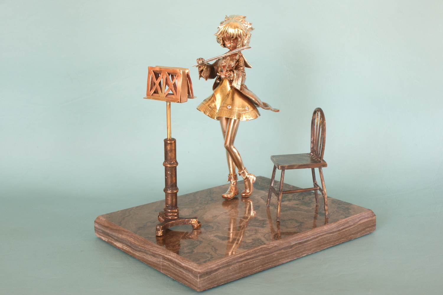 This figure is cast in a bronze made from copper and tin. The body, legs, hands and head are cast separately and soldered together. Her hair is cast in a yellow brass. Her violin and bow are cast in a white bronze that looks like silver. Her skirt is also cast in a yellow brass.