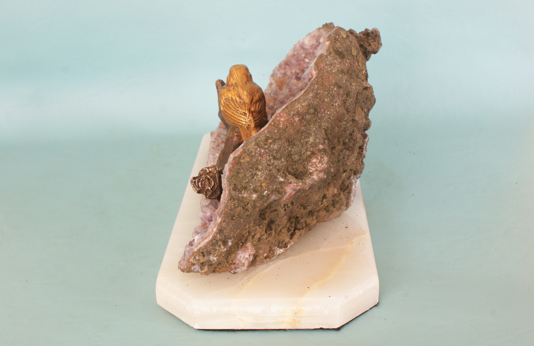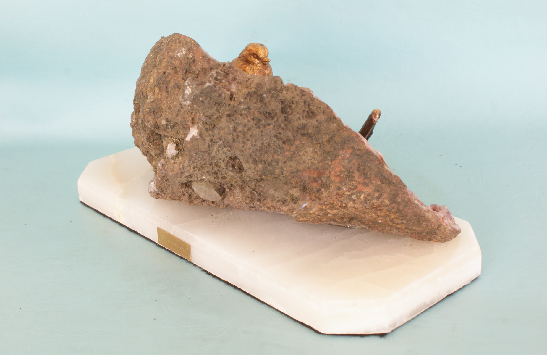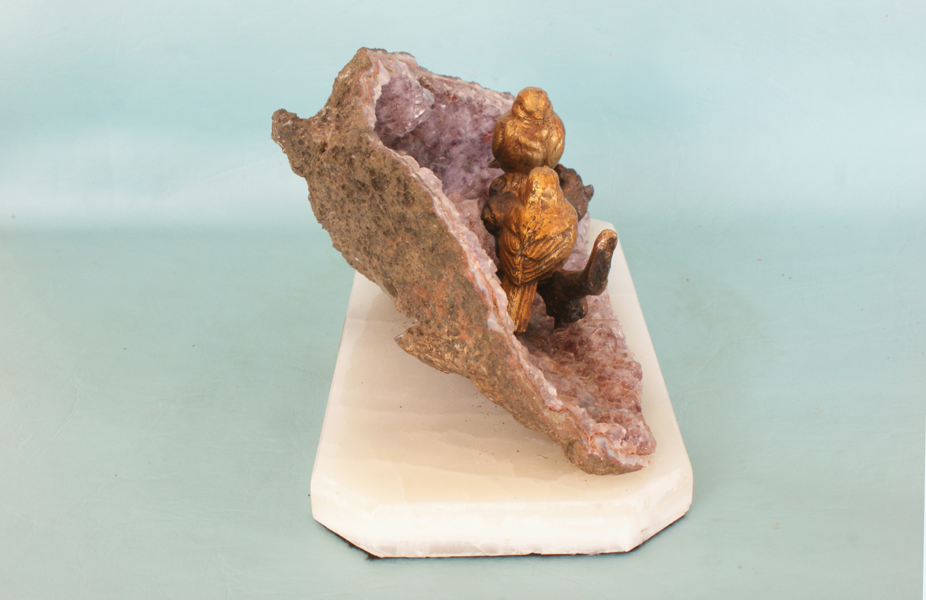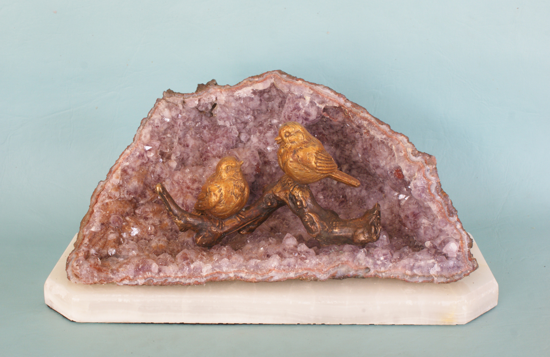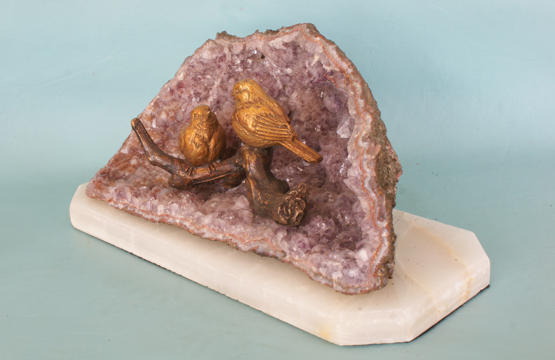 The two birds were each given a ferric nitrate patina for a rich brown colour. The twig has a liver of sulphur (potassium sulphide) patina for a dark colour.